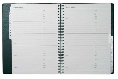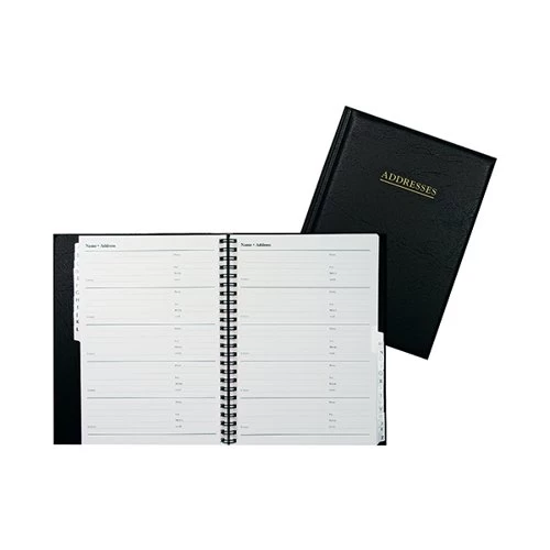 Keep all your contacts safe and in one place with this wirebound address book from Collins. The padded black vinyl cover adds a professional and smart look to this A5 address book, which is ideal for business use. The wirebinding is ideal for flexible use and allows the address book to lie flat when open, while the A-Z tabulated index make finding contacts easier. Telephone and address pages also have space for email, home, office, fax and mobile.