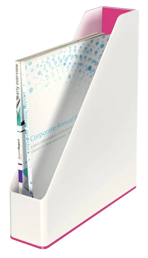 The Leitz WOW Magazine File features a stylish metallic dual colour scheme with a modern and contemporary design. Suitable for documents up to A4 in size, this magazine file has a 73mm spine and is perfect for storing all types of documents including catalogues and magazines. With dimensions of W73 x D272 x H318mm, this pack contains 1 white/pink magazine file. Buy any 3 WOW products and claim a free Leitz Cosy Footrest.