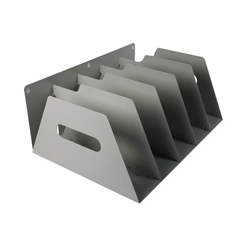 A smart and unobtrusive grey metal filing rack from Rotadex that will organise up to five lever-arch files. Designed to either be attached to a wall or sit on a desktop, the rack presents an ideal way to keep those odd folders looking neat and professional. With non-slip rubber feet to avoid marks and scuffs, you can rest assured your desktop will remain in top condition. Small and sturdy, this is the perfect solution for your personal filing needs.
